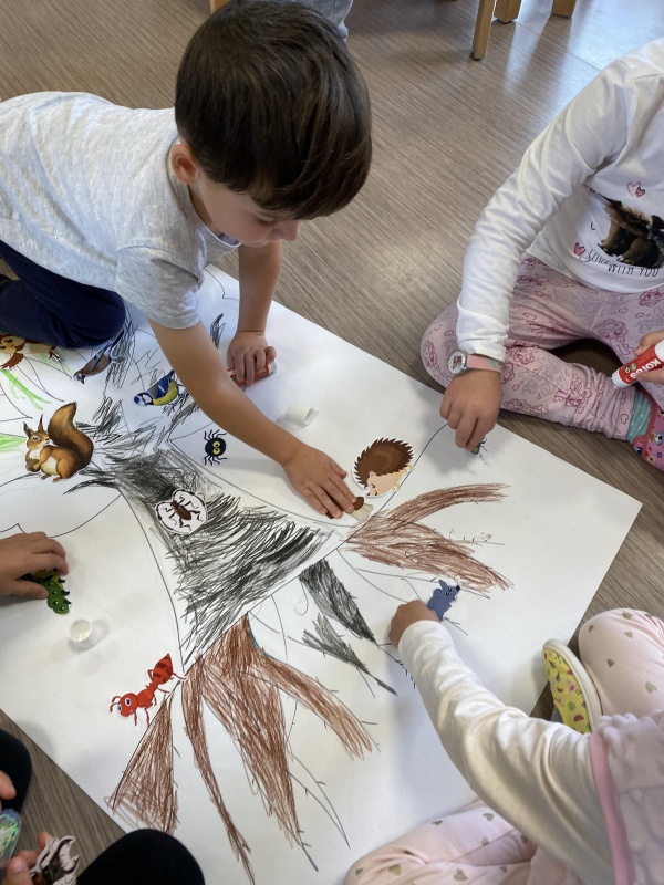 Dělali jsme společnou práci. Malovali jsme strom, na který jsme lepili zvířátka. Povídali jsme si o tom, kde přesně na stromě žijí.