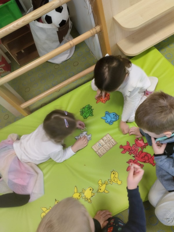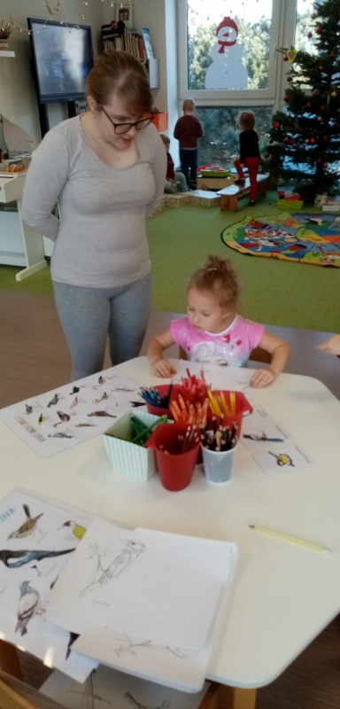 Také jsme vyráběli atlas ptáků. Všichni jsme si vymalovali ptáčky podle obrázků, vystřihli a nalepili na papír, kde následně dále dolepujeme informace, co má ptáček rád na jídlo, odkud je nebo jestli je u nás přes zimu.
